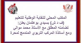 بيان استنكاري إن المكتب المحلي للنقابة الوطنية للتعليم العضو في الفدرالية الديمقراطية للشغل فرع سيدي بوعثمان وهو يتابع عن كثب تنامي ظاهرة العنف بالمؤسسات التعليمية والاعتداء على نساء ورجال التعليم داخلها، فإنه يعبر عن إدانته الشديدة للاعتداء اللفظي والجسدي الذي تعرض له الأستاذ محمد موالي أستاذ التعليم الثانوي الإعدادي بالمركب …