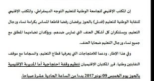 التنسيق النقابي الثنائي بين النقابة الوطنية للتعليم- فدش والجامعة الوطنية للتعليم- التوجه الديمقراطي يعلن تضامنه المطلق واللامشروط مع الأستاذ المعنف بورزازات، ومع باقي الأطر التربوية والادارية للتربية والتكوين.. ويدعو إلى: إضراب وطني بالتعليم لمدة 24 ساعة يوم الخميس 09 نونبر 2017 ودعم كل الاحتجاجات المدافعة عن كرامة نساء ورجال …