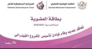 يخبر المكتب الوطني للنقابة الوطنية للتعليم (ف د ش) الاخوة والاخوات المنخرطين والمنخرطات ان النقابة الوطنية للتعليم قد اصدرت بطاقات العضوية برسم السنة الحالية 2015 ـ 2016 وتجدونها لدى المسؤولين النقابيين بفروع النقابة المحليين والاقليميين والجامعيين ، علما انه لم يطرأ عليها اي تغيير من حيث الثمن 75,00 درهما وتجدون …